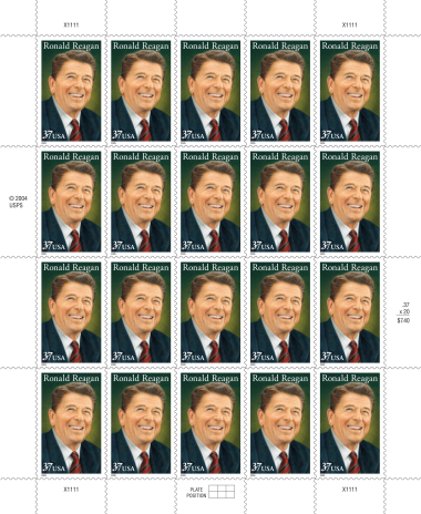 On February 9, 2005, the U.S. Postal Service issued a stamp honoring former President Ronald Reagan, who died on June 5, 2004. Reagan’s patriotism, charisma, and optimistic confidence rallied the nation and made him one of the most popular Presidents of the 20th century.