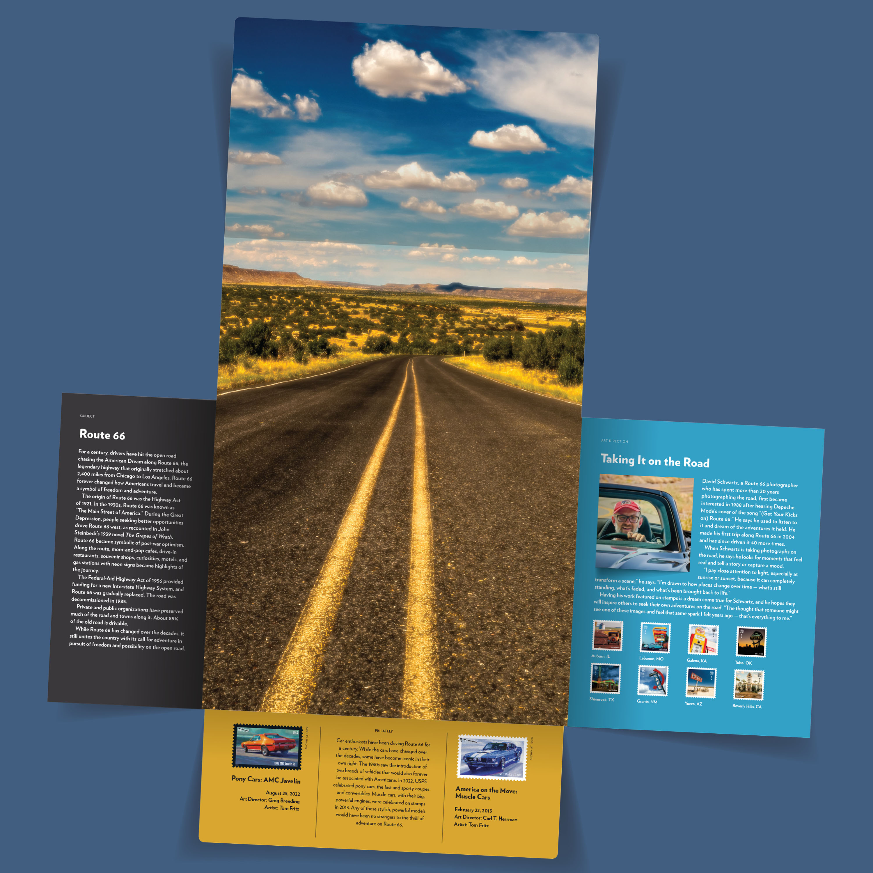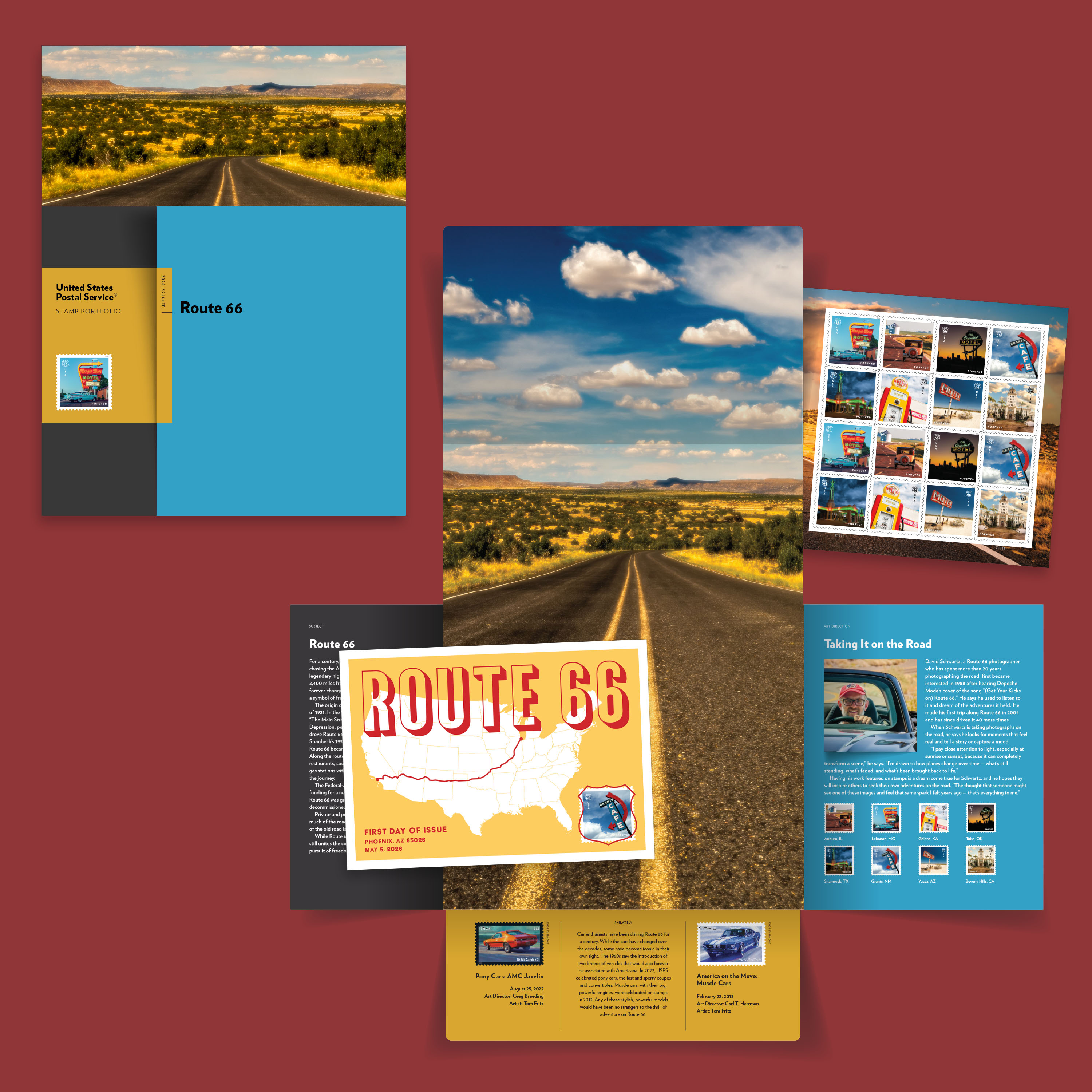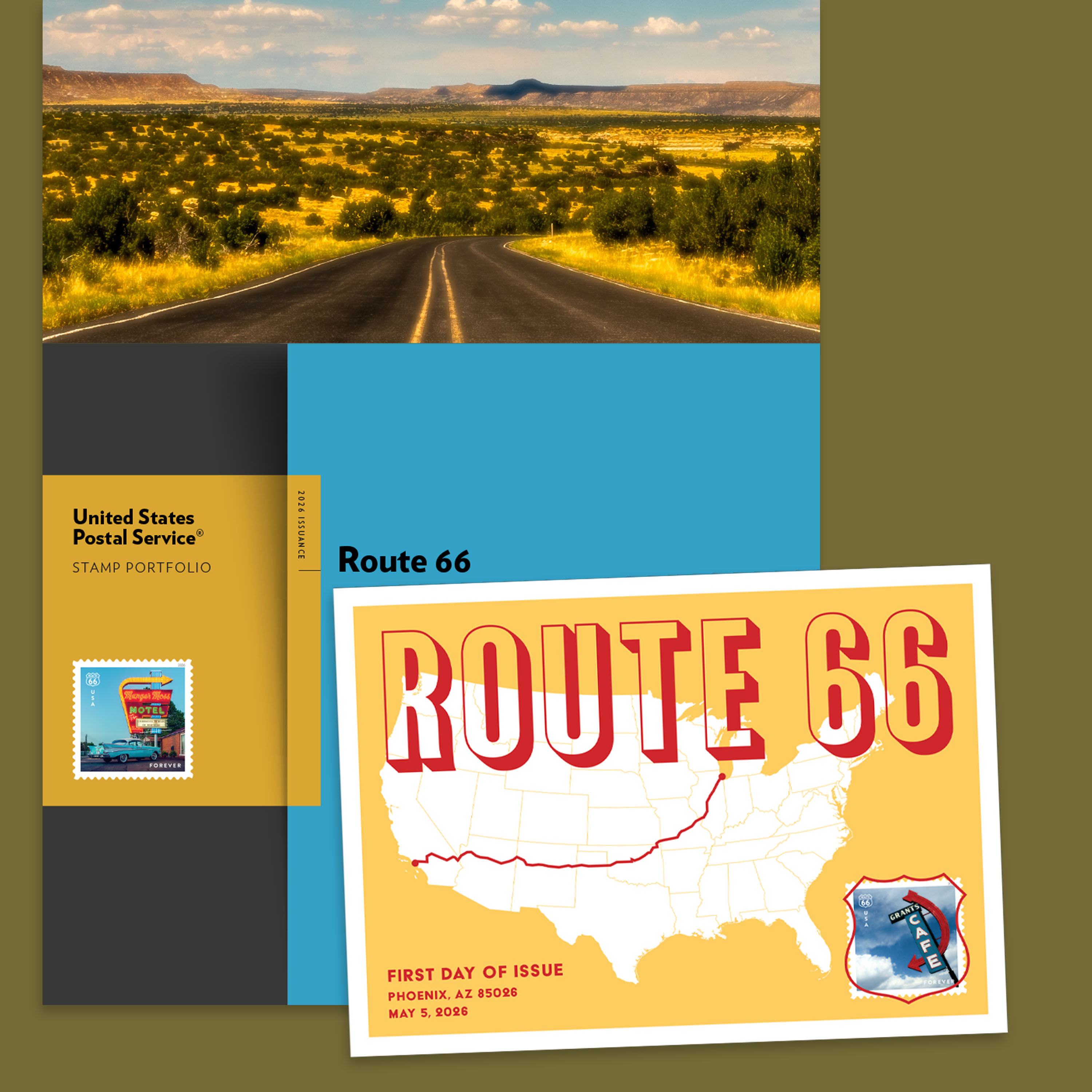 Learn more about the legendary highway that originally stretched about 2,400 miles from Chicago to Los Angeles, as well as the stamp design process to honor it, with the Route 66 Stamp Portfolio.