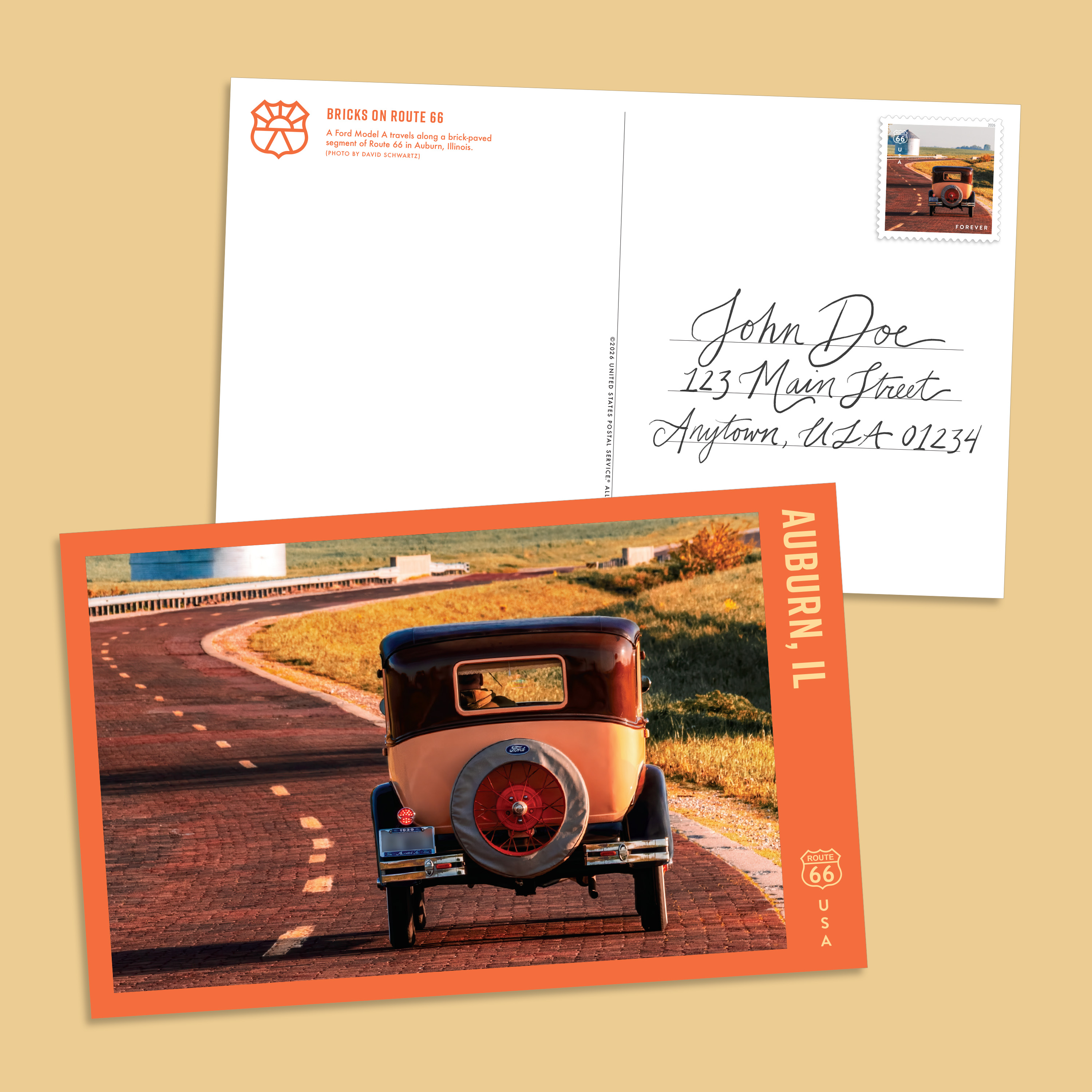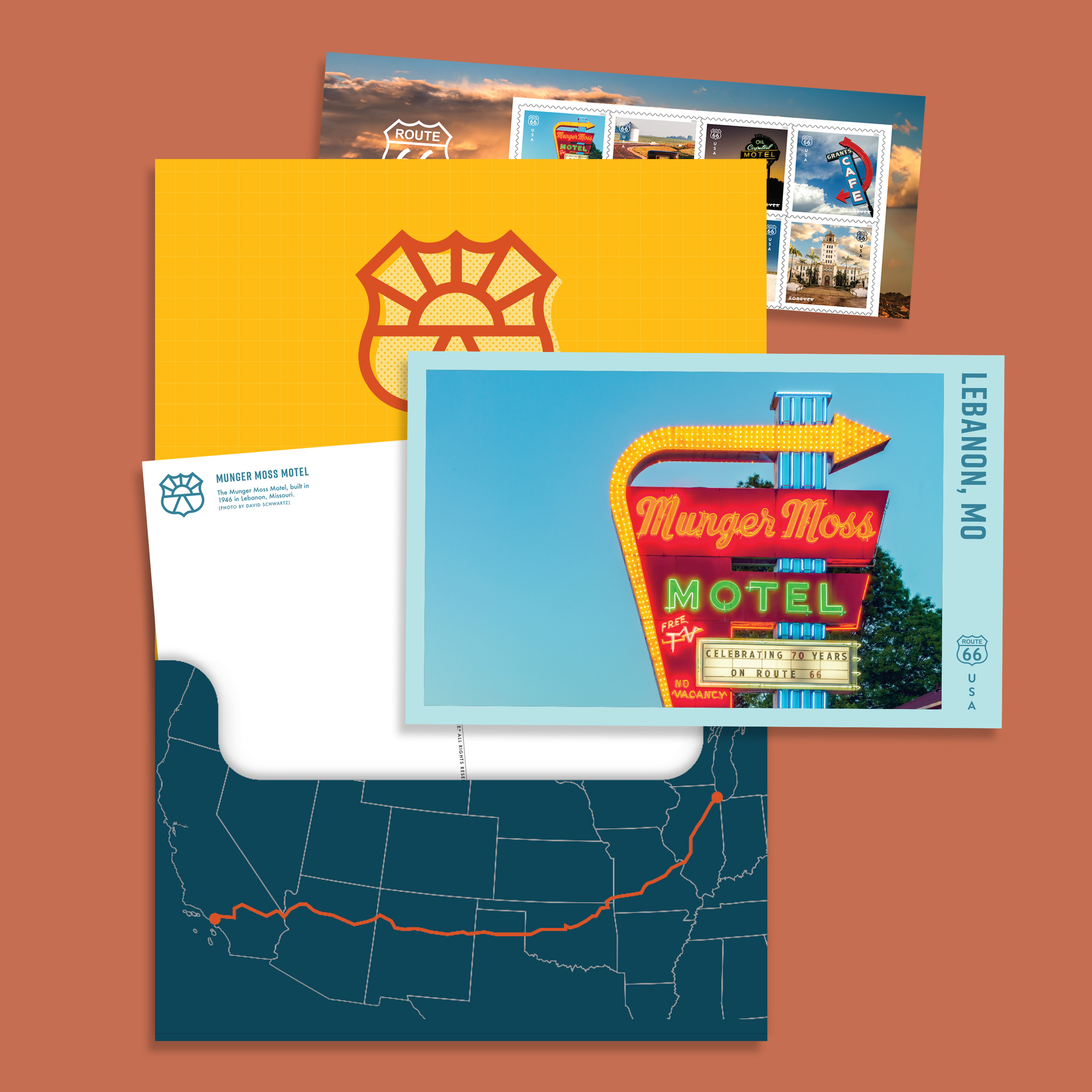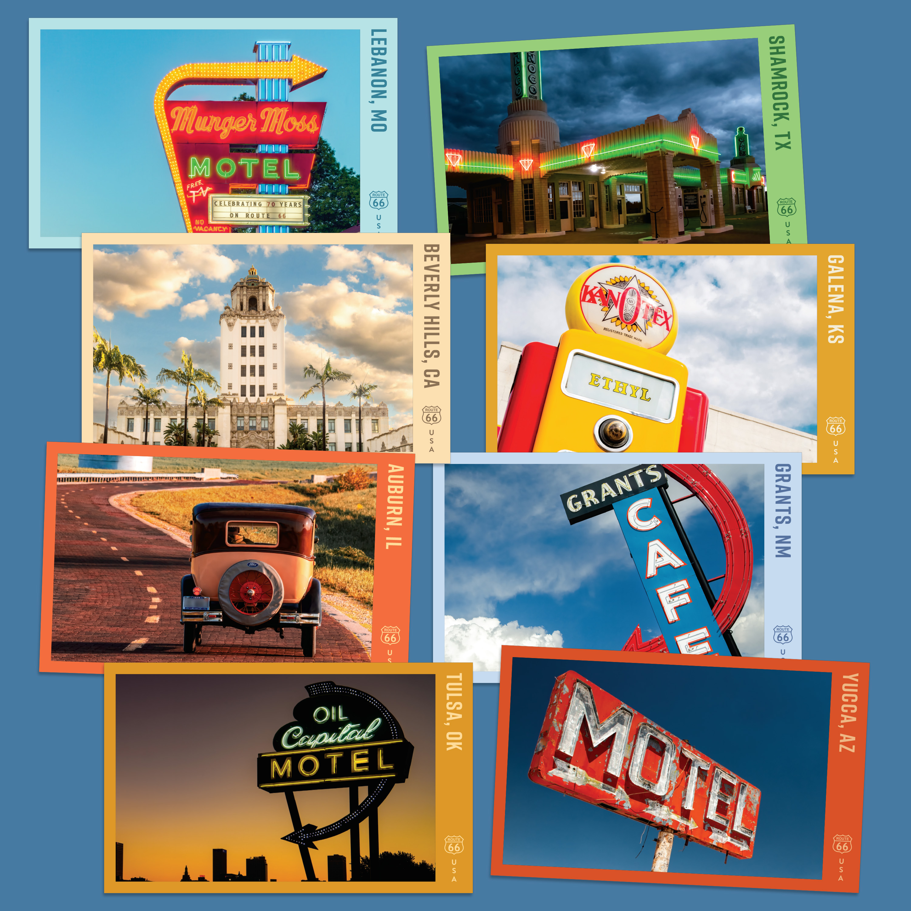 Send notes from your travels with this set of Route 66 Oversized Postcards, including 8 postcards and 8 coordinating Forever® stamps tucked inside a custom pocket folder.