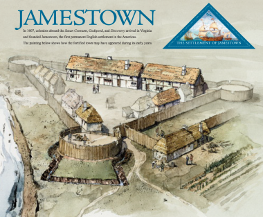 The selvage area on the front of the sheet includes a painting of Jamestown by artist Richard Schlecht. An earlier version of this painting appeared in the June 2002 issue of National Geographic magazine. That version was updated with the help of archaeologists currently excavating the site of the Jamestown fort. The revised art attempts to show how the fortified settlement may have looked during its earliest years. The “ghosted” areas represent parts of the fort that had not been excavated at the time of the update.