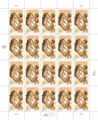 With the Sickle Cell Disease Awareness stamp, the U.S. Postal Service continues a tradition of raising public consciousness of health and social issues. Art director Howard Paine and artist James Gurney, of Dinotopia fame, settled on a humanistic approach; Gurney’s oil painting stresses the love between parent and child. Typographer John Boyd created the legend across the top reading "TEST EARLY FOR SICKLE CELL."