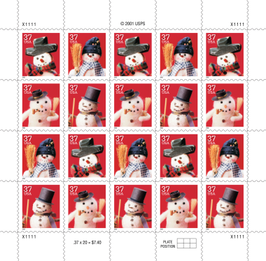 The U.S. Postal Service's 2002 Holiday issuance features photographs of four whimsical snowmen figurines. Popular in folklore, literature, and song, snowmen have come to symbolize the joy and magic of the holiday season and often evoke fond childhood memories of playing in the snow.