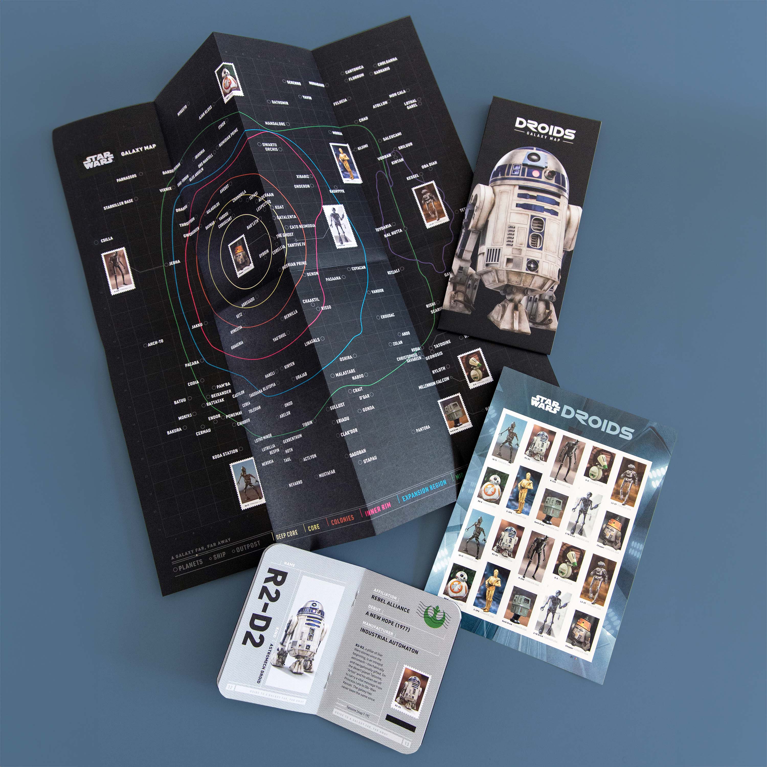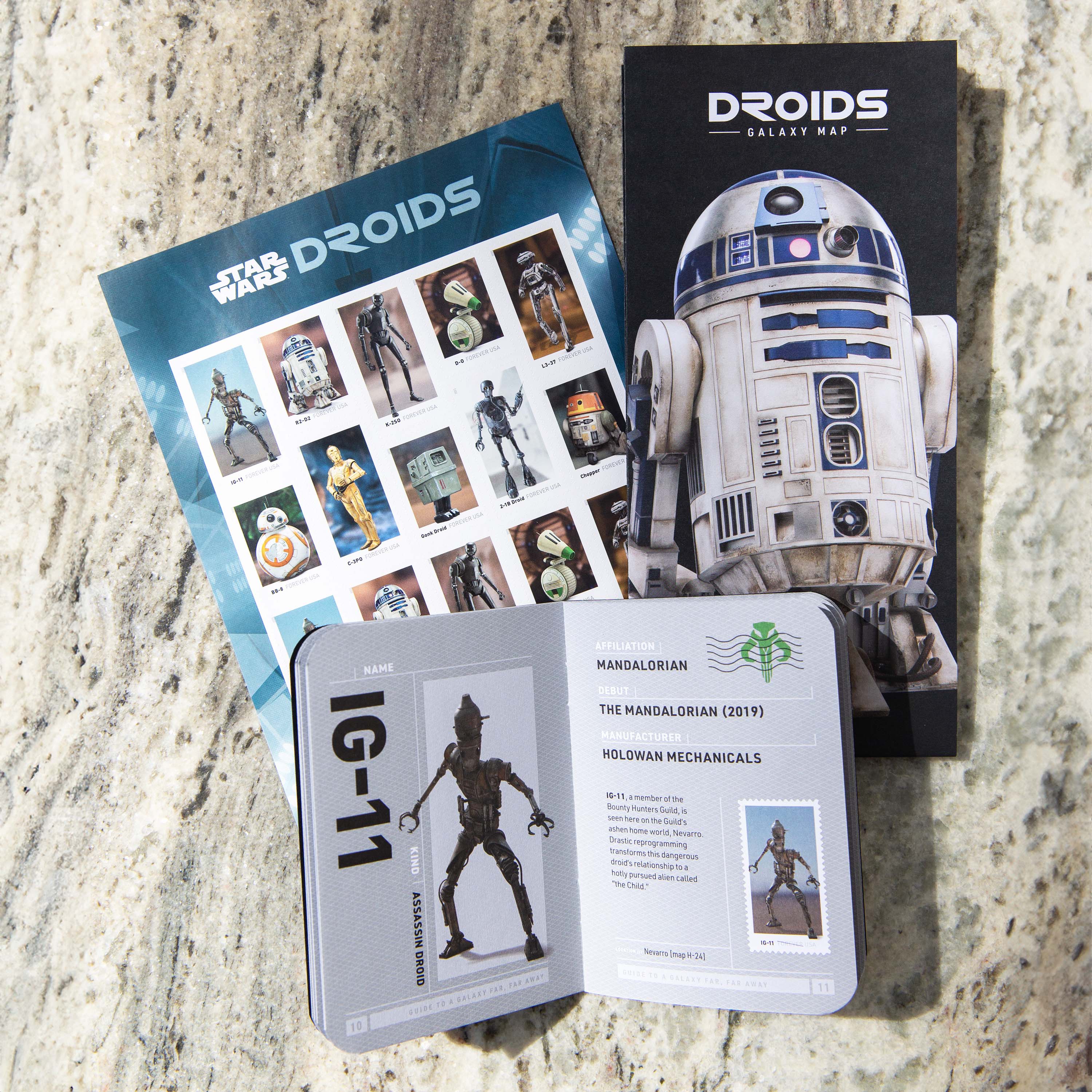 Prepare to embark on your next mission with this fun guide to the Star Wars™ galaxy and its marvelous mechanical denizens. Includes an embossed guide booklet with the most memorable droids from the saga, along with a pane of 20 Star Wars™ Droids Forever® stamps and a map to the galaxy inhabited by C-3PO, R2-D2, and other beloved droid characters.