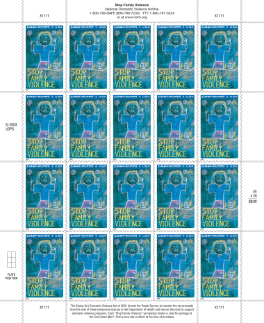 Family violence is a national concern; its effects are felt regardless of age, race, or economic status. This semipostal has the distinction of featuring the work of a young artist who was originally intended to be the model in a photograph. When art director Carl T. Herrman and photographer Philip Channing saw a chalk drawing by Monique Blais, made during a break in their session, they realized there could be no better way to express the pain and sadness caused by domestic violence than to use artwork by a child. The final art is Monique’s drawing, at Herrman’s suggestion, of a "sad Mommy."