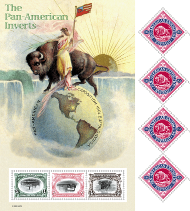 The 2001 souvenir sheet also includes four reproductions of a cinderella that originally commemorated the 1901 Pan-American Exposition. (A cinderella is an item that resembles, but is not an official government-issued postage stamp). The design of the red and blue, diamond-shaped cinderella features a charging buffalo at center encircled with the words “Pan-American Exposition Buffalo.” The addition of an 80-cent denomination makes each of the four cinderella reproductions official postage stamps.