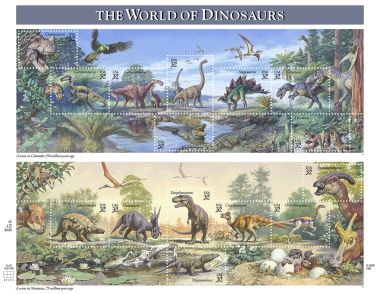 Originally titled “Masters of the Mesozoic,” The World of Dinosaurs began as one block of four stamps, but the project quickly expanded to show two scenes from prehistoric North America: Colorado during the Jurassic period, approximately 150 million years ago; and Montana during the Cretaceous period, around 75 million years ago.