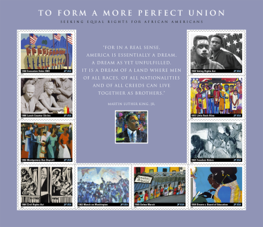 Our nation’s founders created the Constitution “in order to form a more perfect union.” In 2005, the U.S. Postal Service recognized the courage and achievement of the men and women who, during the years of the civil rights movement, struggled to bring the vision of the founders closer to reality. The civil rights movement helped to correct the misconception that great numbers of people were second-class citizens. Each stamp on this sheet presents a detail from a contemporary artwork commenting on historical events. A separate paragraph describes each of these 10 important milestones of the civil rights movement.