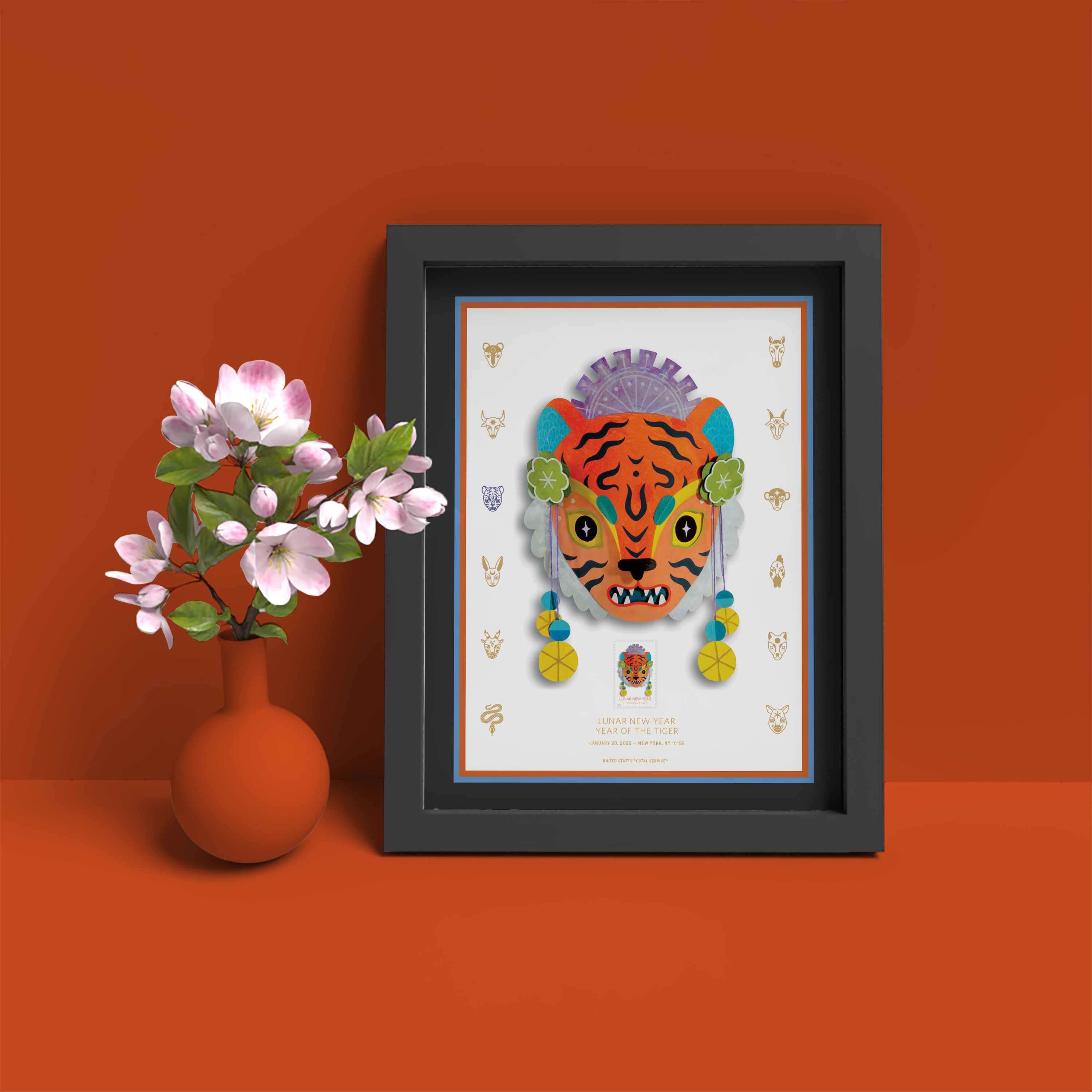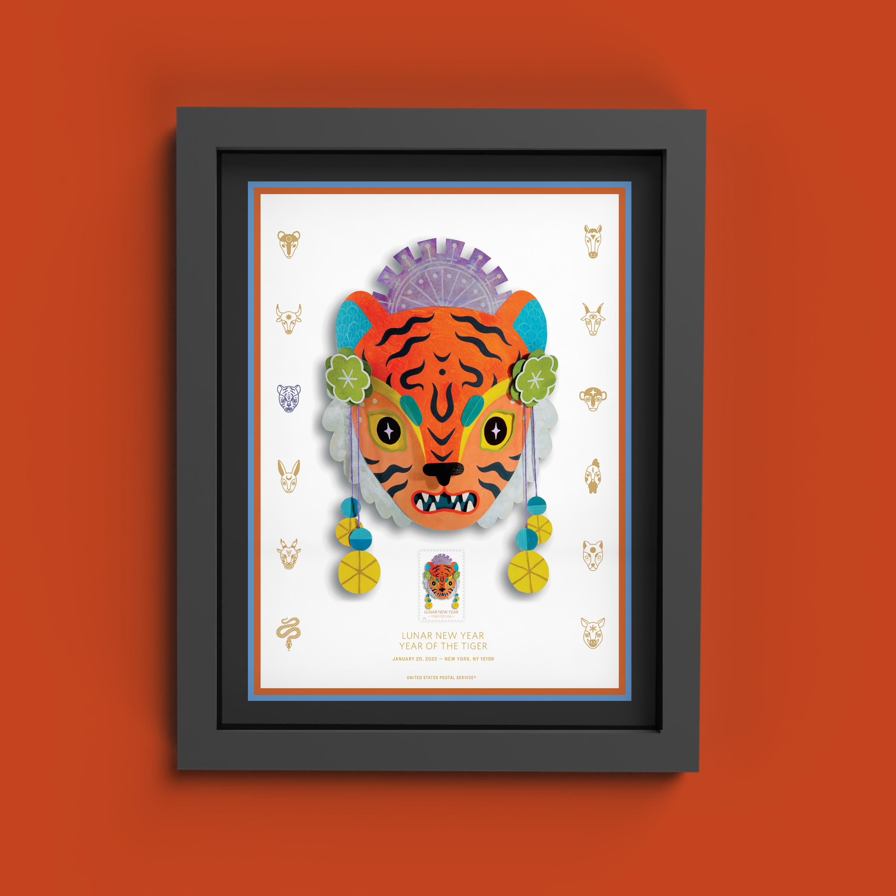 Ring in the new year of luck and prosperity with this 11.5" x 14.5" framed piece, which features the mask art from the stamp, plus a mounted Lunar New Year • Year of the Tiger Forever® stamp and the First Day of Issue details.