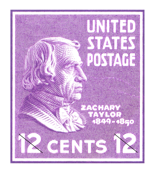Zachary Taylor (1784–1850), the 12th president of the United States, appears on the 12-cent denomination of the 1938 Presidential series. A bust displayed in the Rotunda of the Virginia State Capitol inspired the image. The Postal Service issued the violet stamp in sheet form on September 14, 1938.