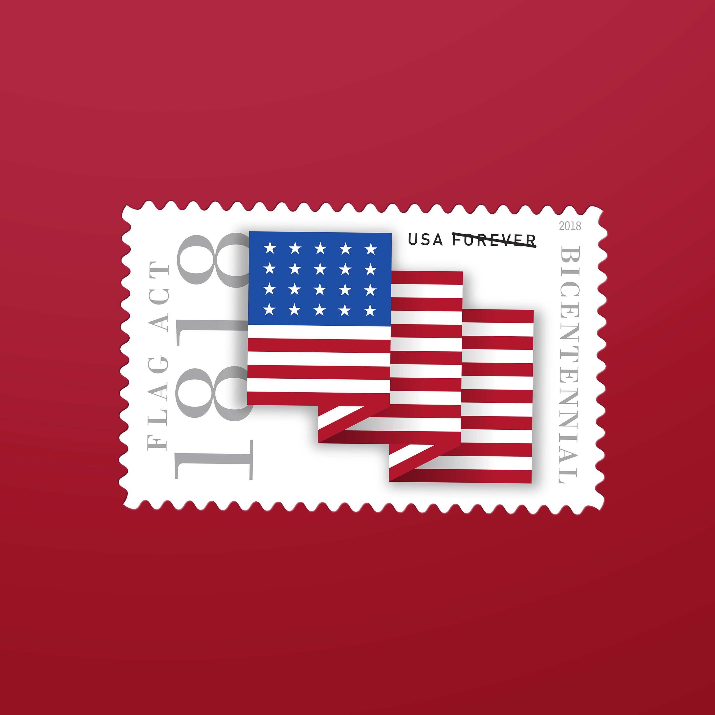 The stamp art celebrating this anniversary shows a flag with 20 stars, the number of states in the Union when the Flag Act of 1818 went into effect. The flag's crisp folds and layering effect convey a sense of the dynamism of the young nation.