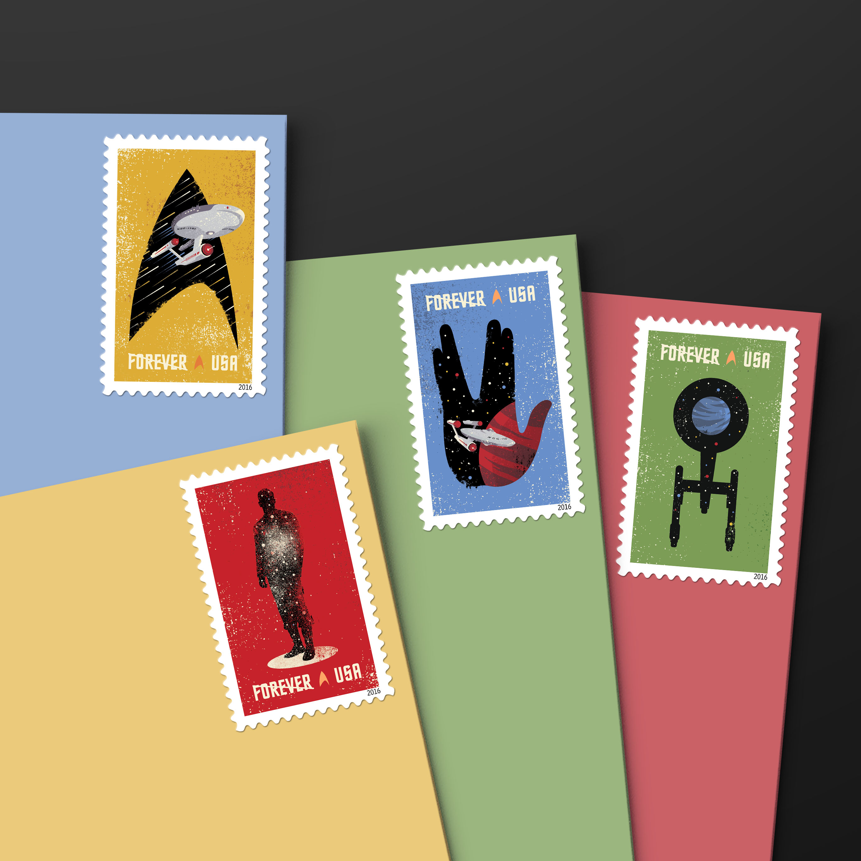 Each stamp showcases one of four digital illustrations inspired by elements of the classic TV show: the Starship Enterprise inside the outline of a Starfleet insignia against a gold background, the silhouette of a crewman in a transporter against a red background, the silhouette of the Enterprise from above against a green background, and the Enterprise inside the outline of the Vulcan salute (Spock's iconic hand gesture) against a blue background. The words “SPACE... THE FINAL FRONTIER,” from Captain Kirk's famous voice-over, appear beneath the stamps against a background of stars.
