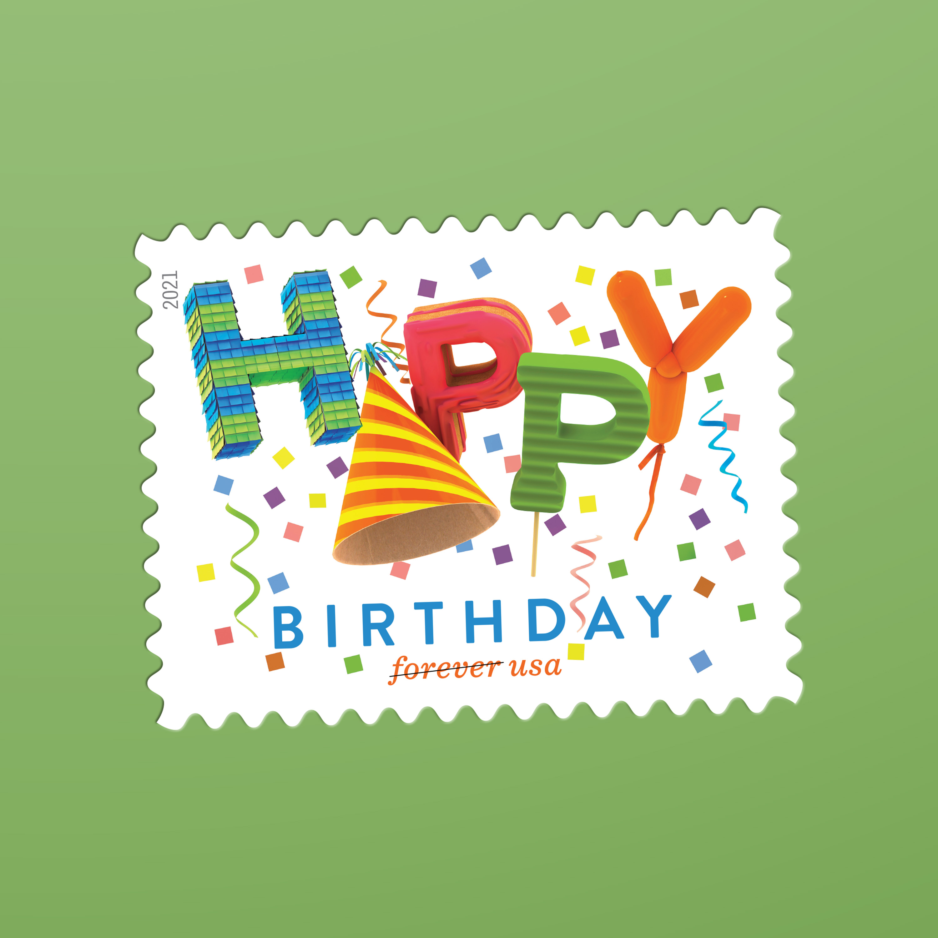This Happy Birthday stamp from 2021 conveys exuberant greetings by calling to mind the childhood excitement of a birthday party. The celebration of birthdays in the United States has its origins in a wide array of cultural traditions. Folklorists and historians claim to see the origins of birthday parties in older practices that resemble our customs, such as candles on a cake, which existed in some form in both ancient Greece and early modern Germany. When we gather to sing, brighten our spirits with candles, and make a wish, these deeply rooted rituals connect us to loved ones and invite everyone to share in the birthday fun.