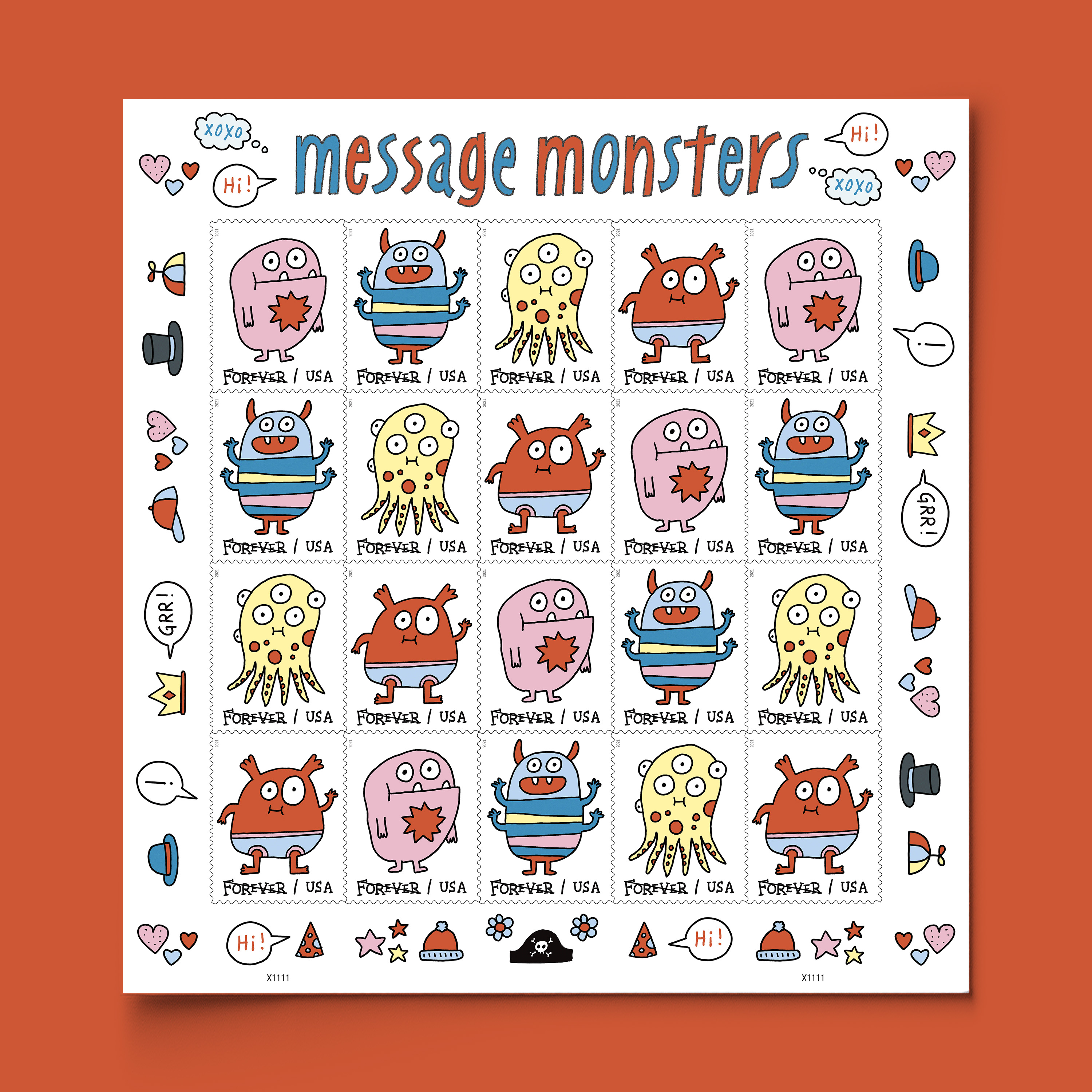 With Message Monsters in 2021, USPS unleashed the most playful, participatory postage stamps ever — stamps that welcome you to customize a collection of cute and crazy critters. Each monster’s mode, mood, and message is customizable — to the delight of sender and recipient alike. Makeover magic transforms the four different designs into countless creature creations. Postage stamps have never been so interactive!