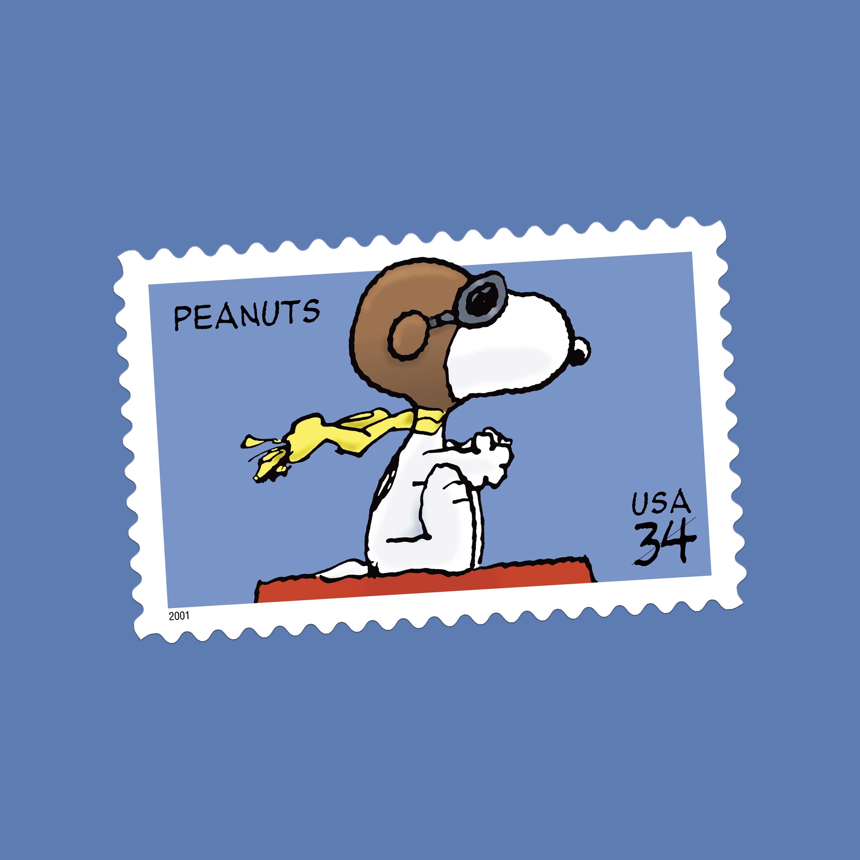Peanuts focuses on the anxieties and joys of childhood as expressed by an ensemble cast of children who often seem wise beyond their years. Among them are the lovable Charlie Brown, who perseveres despite continuous failure; the philosophical, blanket-carrying Linus; the fussbudget Lucy, who dispenses psychological advice for a nickel from behind a concession stand; and toy-piano virtuoso Schroeder. Central to the comic strip is Charlie Brown’s dog, Snoopy, who first stood on his hind legs in 1958 and became extremely popular for his imaginative adventures as a number of characters — among them the World War I flying ace depicted on this stamp.