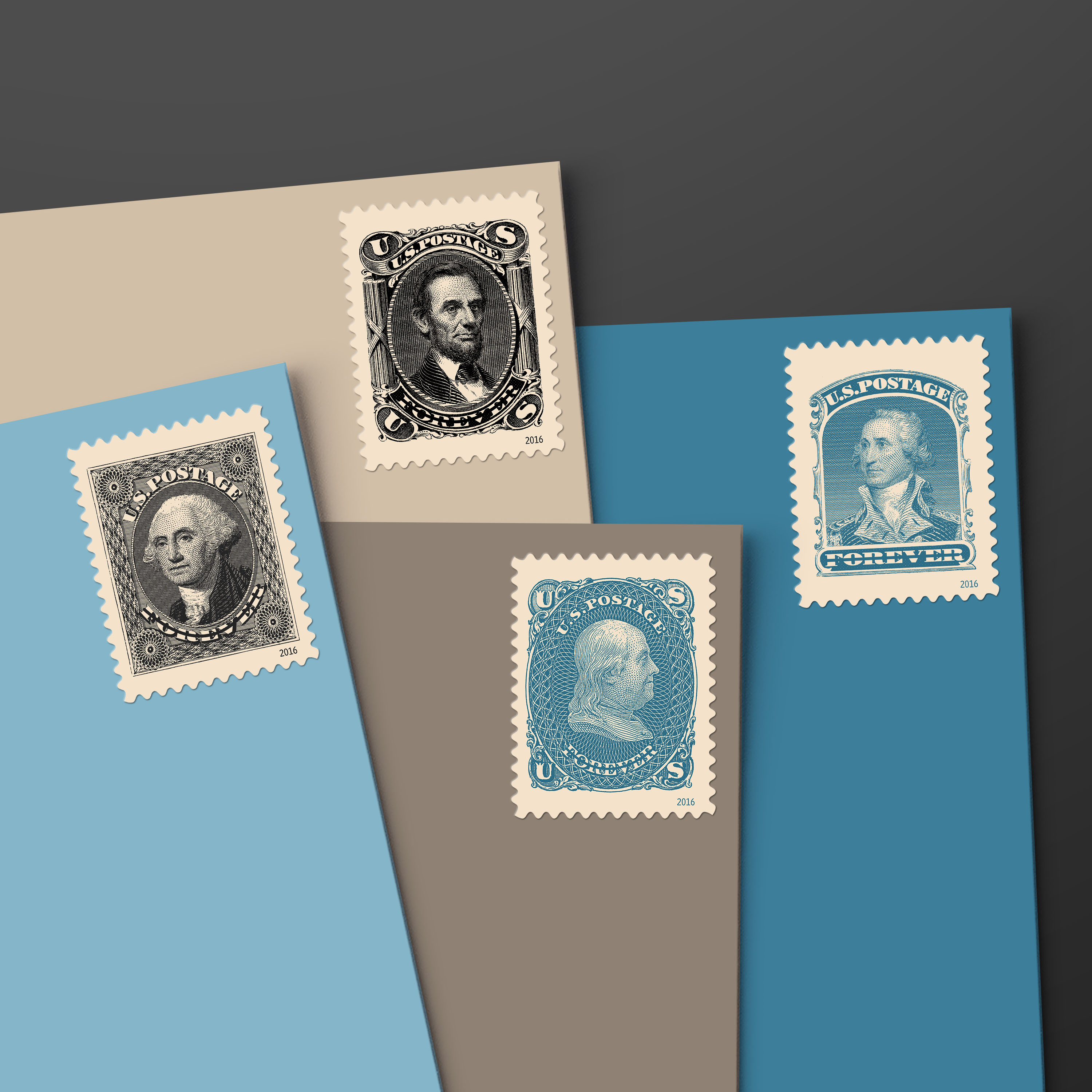 USPS issued this 2016 souvenir sheet in celebration of the long history of U.S. postage stamps — and in appreciation of stamp collectors and philatelists everywhere. The elaborately designed sheet features handsome new versions of six stamps first issued in the mid-19th century. The stamps were printed using the intaglio printing method, as were the originals.