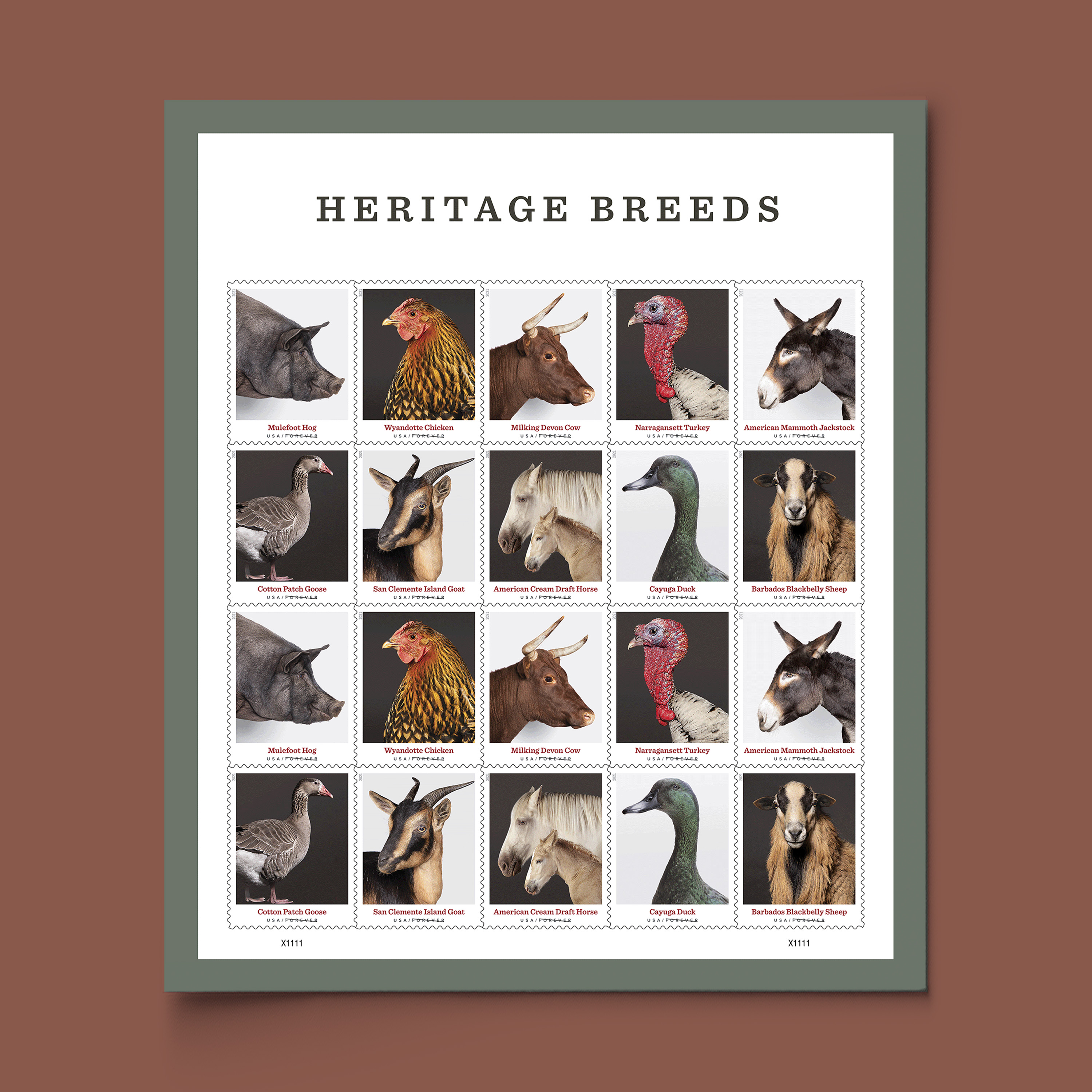 The stamps feature photographs of 10 heritage breeds: the American Mammoth Jackstock donkey, the Narragansett turkey, the Cayuga duck, the San Clemente Island goat, the Mulefoot hog, the Cotton Patch goose, the American Cream draft horse, the Barbados Blackbelly sheep, the Milking Devon cow, and the Wyandotte chicken.