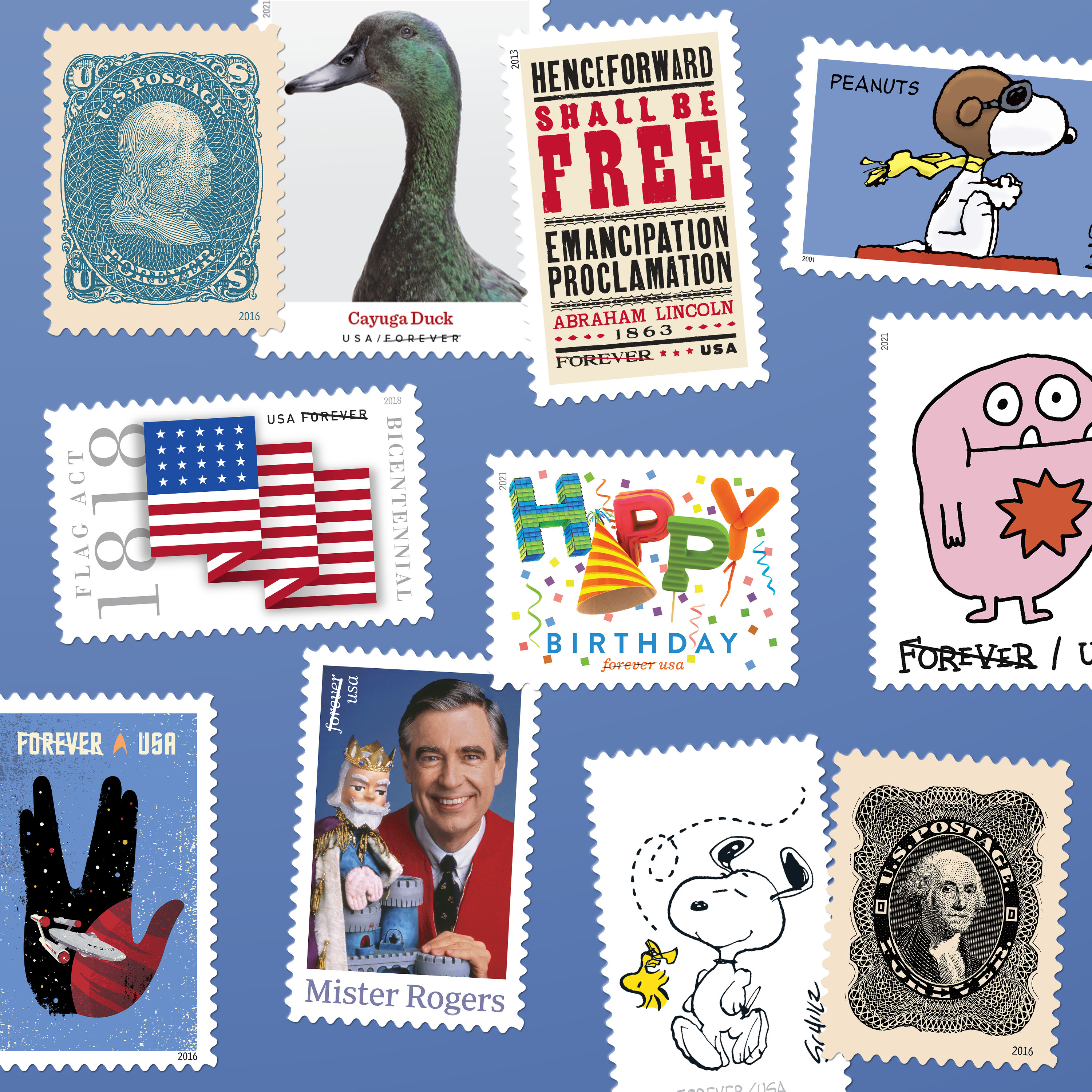 This batch of contestants is as varied as the nation itself. Some honor historic milestones, like the Emancipation Proclamation, the 1818 Flag Act, and a selection of the Postal Service’s earliest stamps. Some commemorate people and classic franchises, including Mister Rogers, Charles M. Schulz, Peanuts, and Star Trek, that highlight our shared humanity and inspire our best selves. Others celebrate heritage livestock breeds or the chance to brighten someone’s day with a friendly monster or a festive birthday greeting.