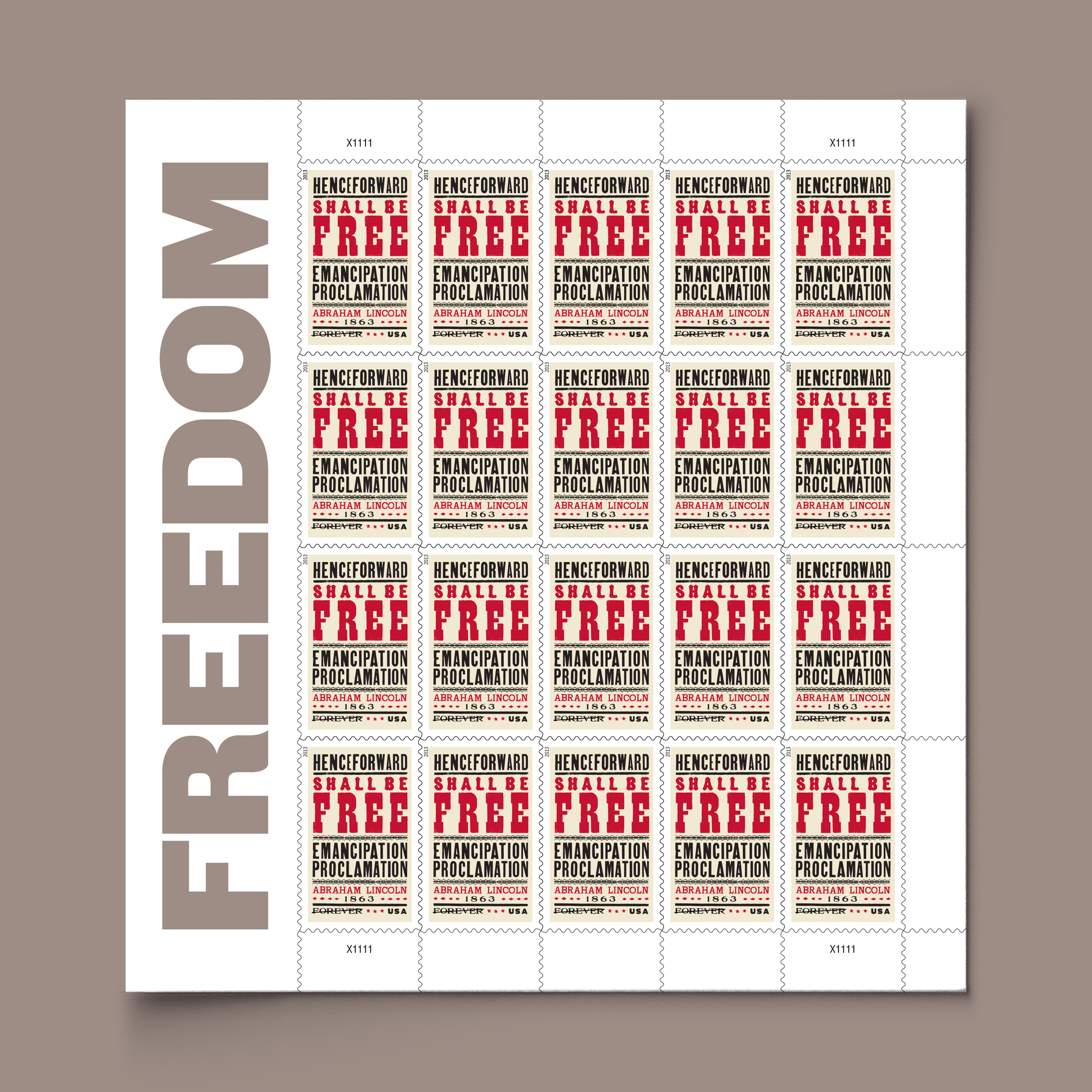 The stamp art uses that powerful statement, “Henceforward Shall Be Free,” on a design evocative of broadsides from the Civil War era. “In giving freedom to the slave, we assure freedom to the free,” Lincoln wrote in a message to Congress one month before signing the Emancipation Proclamation. In the spirit of that sentiment, the word “Freedom” appears in large type on the selvage of The Emancipation Proclamation stamp.