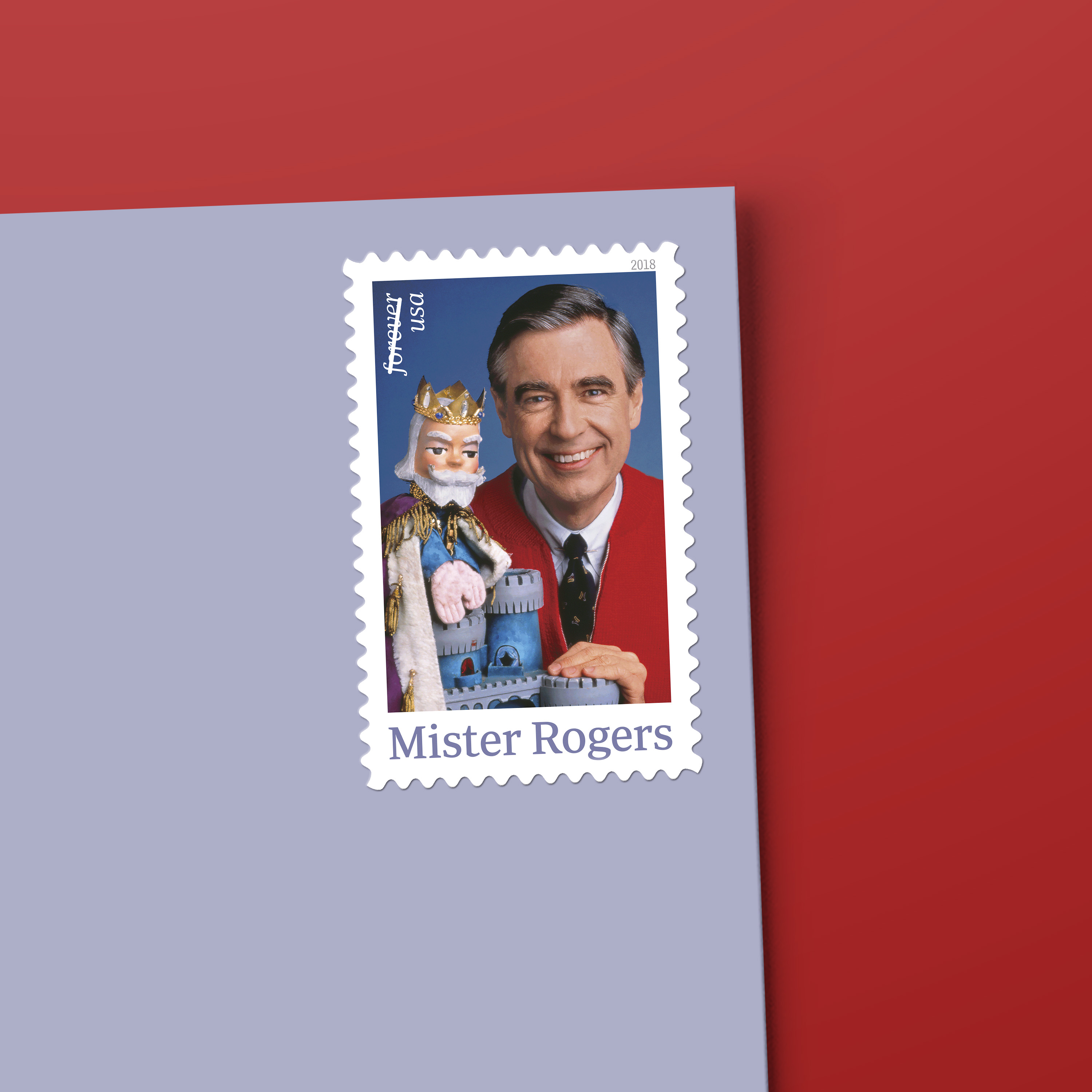 The stamp features Walt Seng’s photograph of Rogers in a red cardigan and also includes puppet King Friday XIII, a Mister Rogers’ Neighborhood character hailing from “The Neighborhood of Make-Believe.” The words “Forever” and “USA” appear in the left corner.