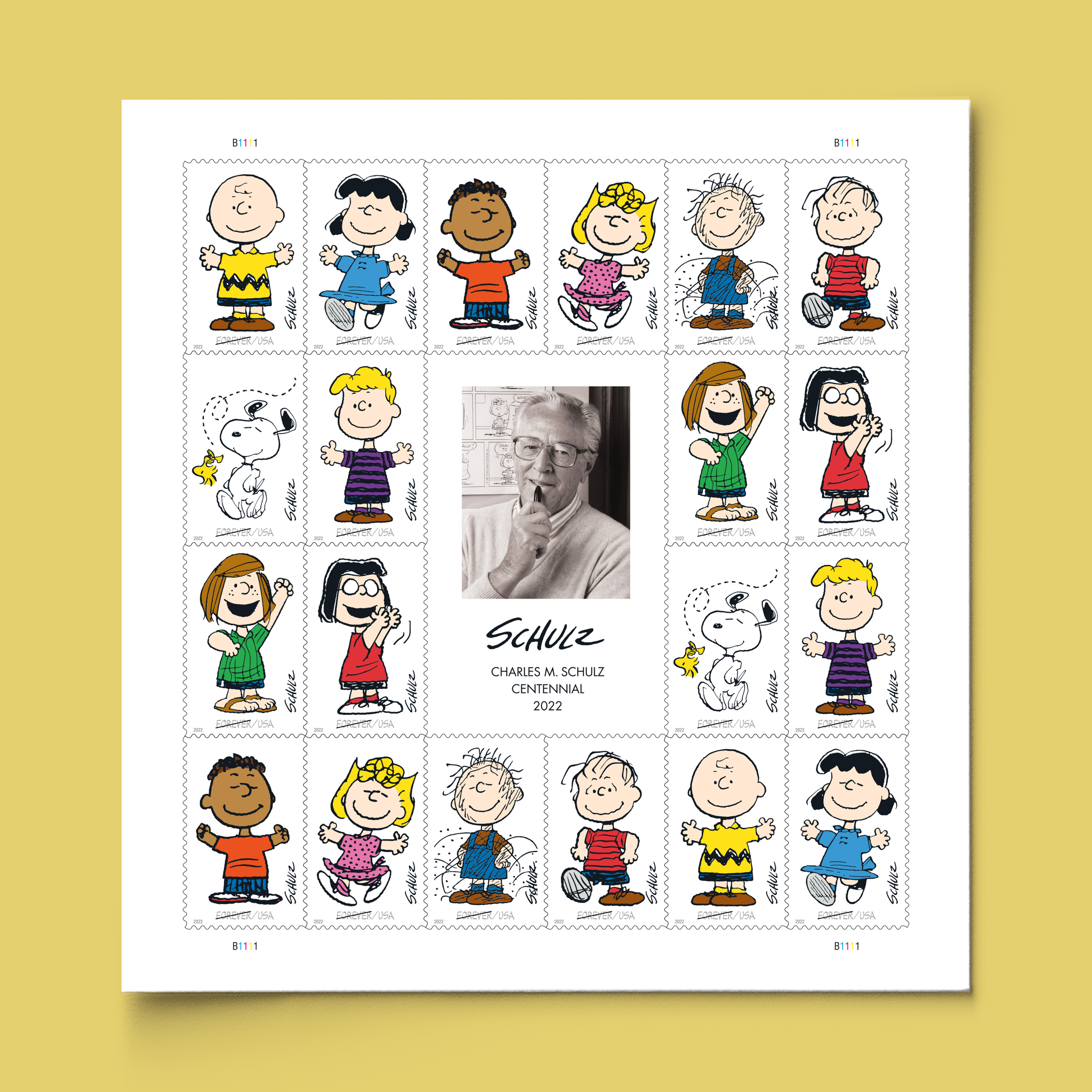 The sheet of 20 stamps includes 10 different designs that showcase the unforgettable friends from the most successful comic strip in the history of the medium. They are: Charlie Brown, Lucy, Franklin, Sally, Pigpen, Linus, Snoopy (with Woodstock), Schroeder, Peppermint Patty, and Marcie. The characters form a frame around a 1987 photograph of the cartoonist, and Schulz’s surname signature appears in black, reading vertically upward along the right-hand side of each stamp.