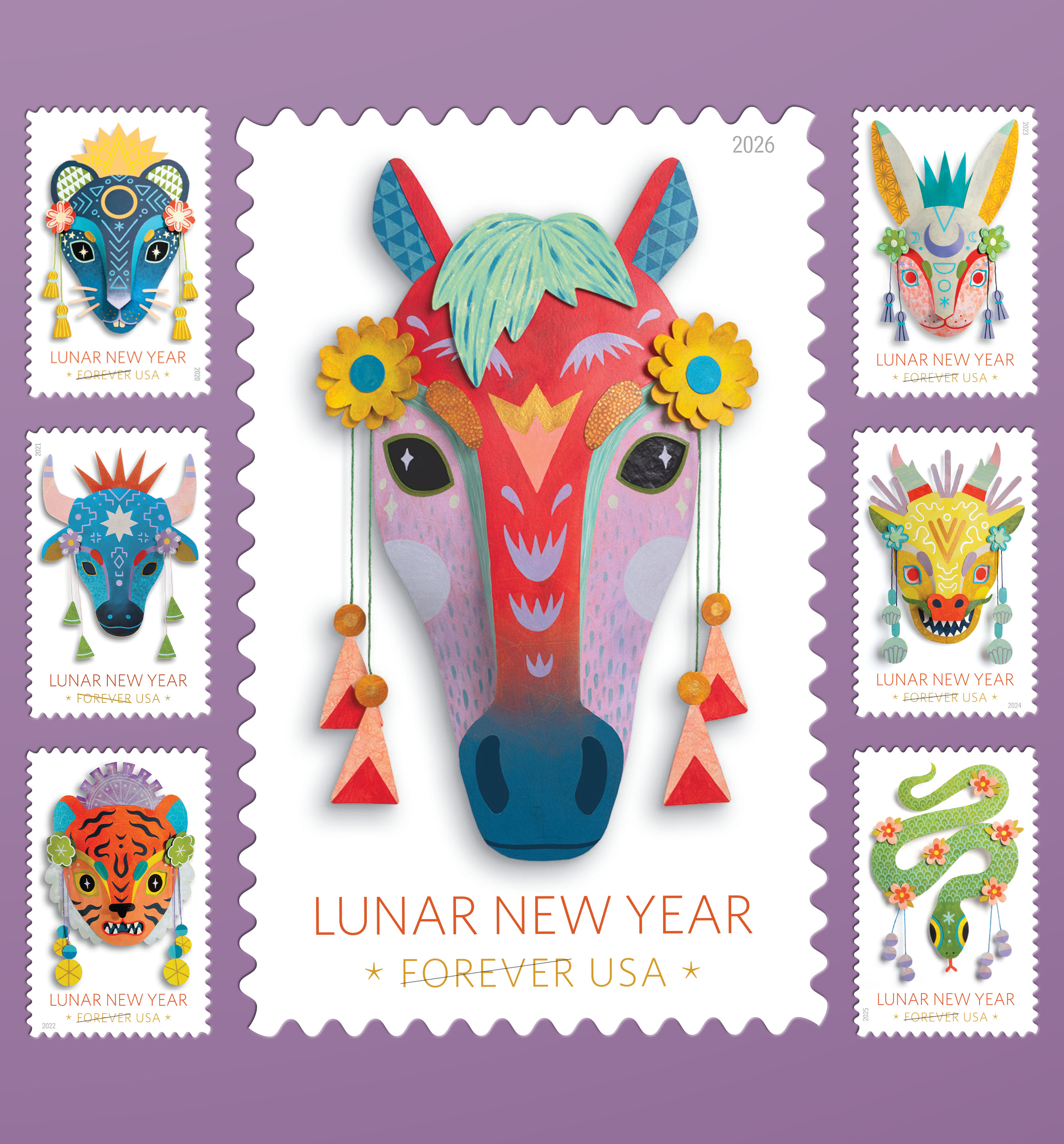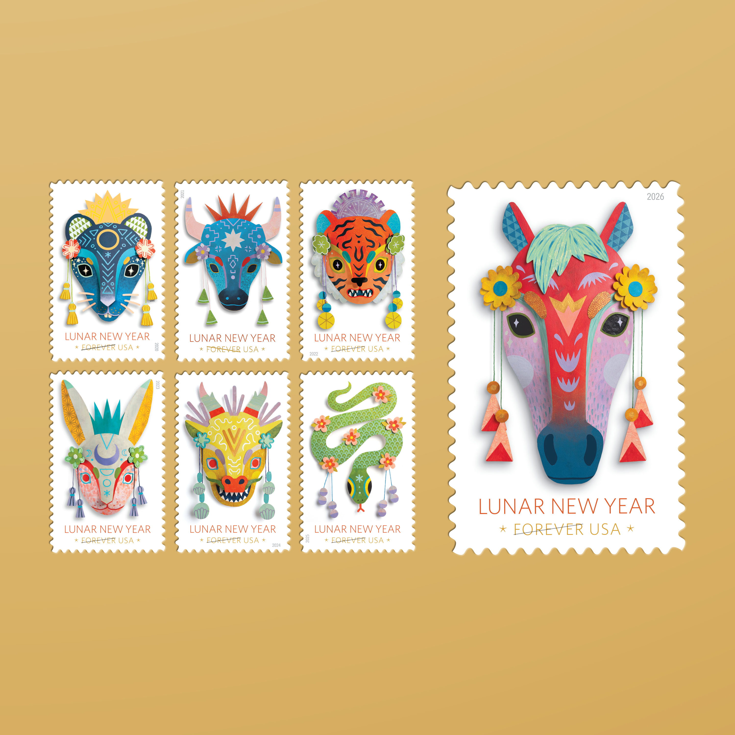 In the current Lunar New Year series, masks take center stage, each one a handcrafted interpretation of the year’s zodiac animal designed by artist Camille Chew under the creative direction of art director Antonio Alcalá. With the 2026 Year of the Horse stamp, the series continues its bold exploration of color, texture, and symbolism, offering a striking fusion of contemporary design and traditional imagery.