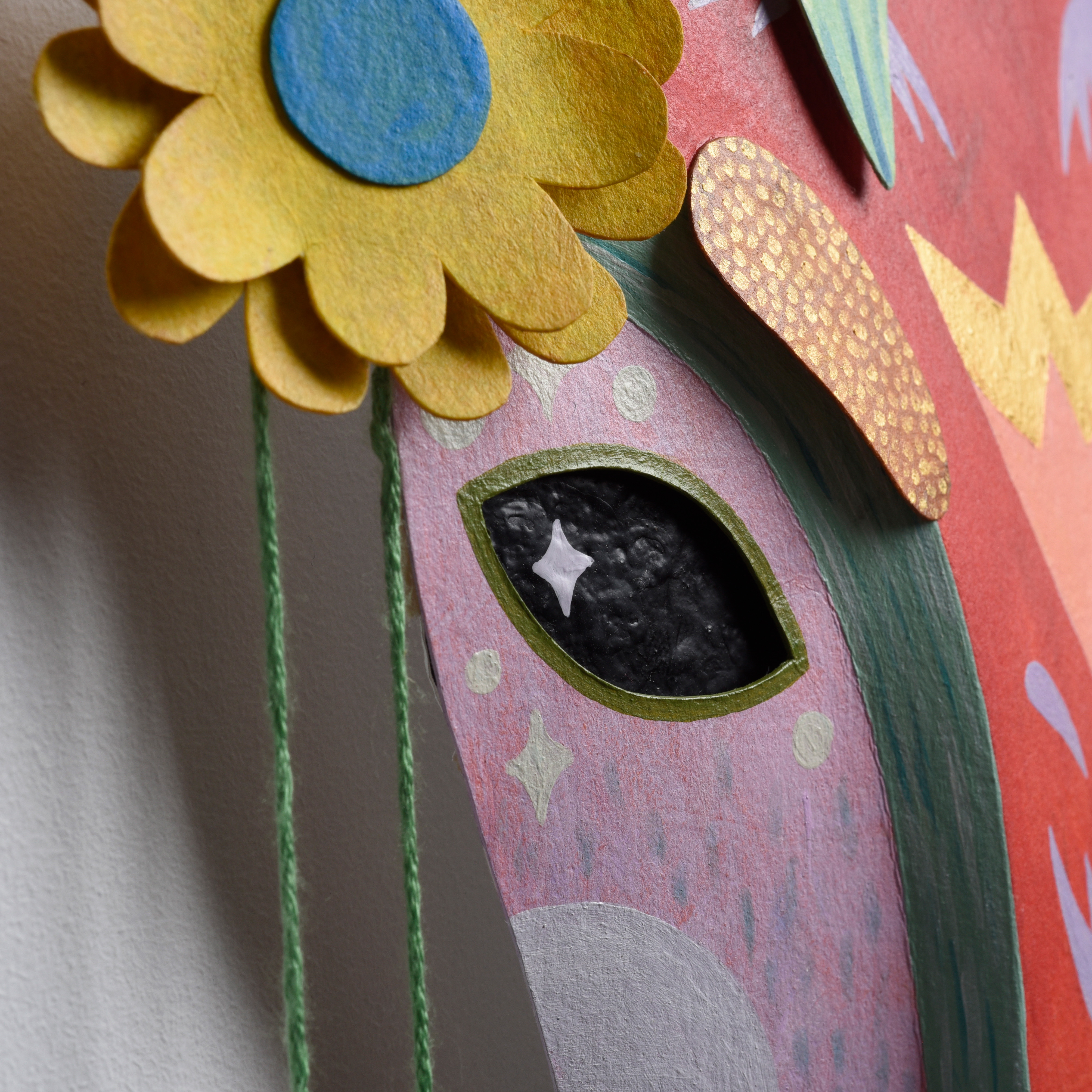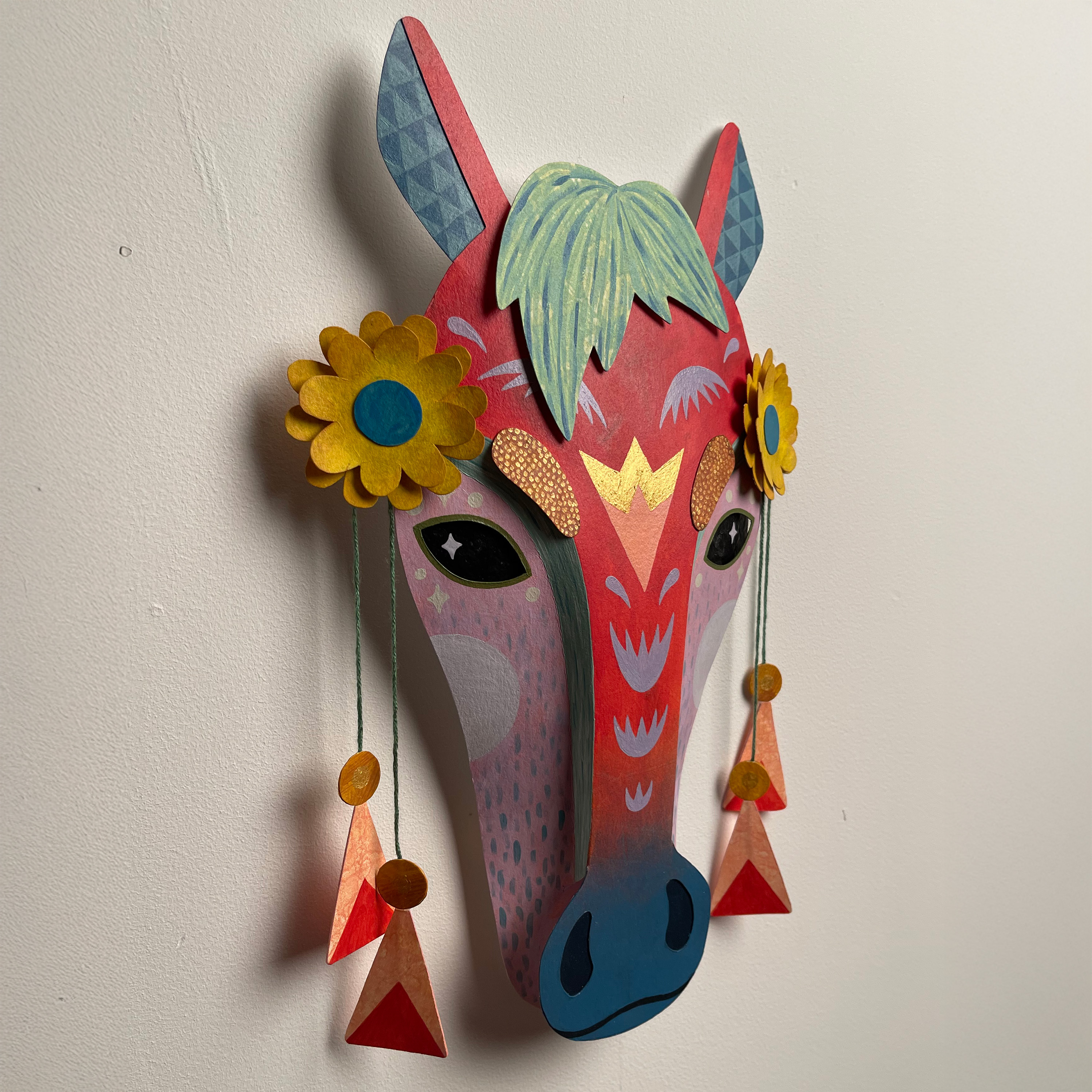 The enthusiasm is understandable: Chew’s masks are intricate, dimensional works with layers of color, carved shapes, and hanging decorative elements that bring each animal’s personality to life. But those same elements create difficulties when translating a sculptural object into a two-dimensional printed form.