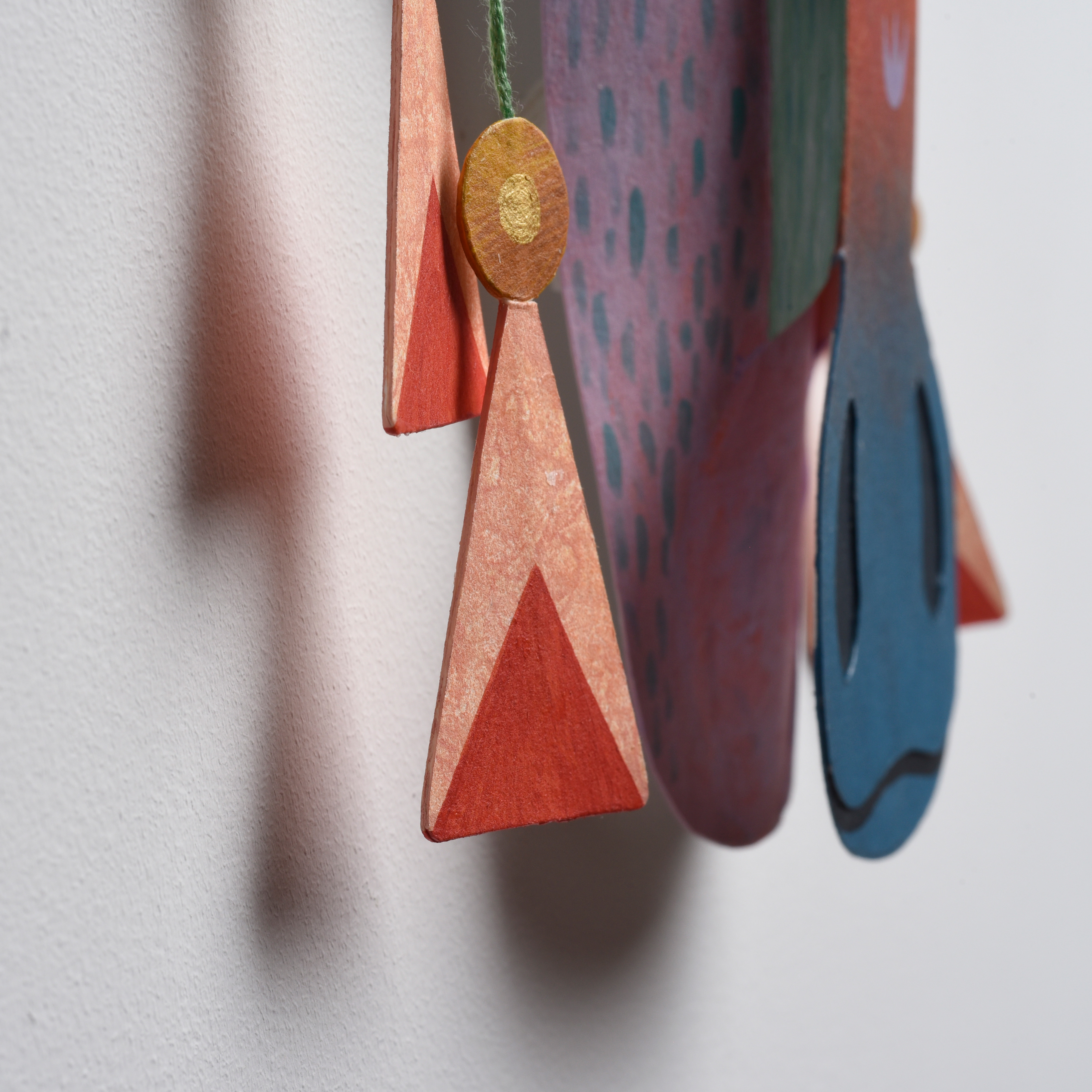 “The mask is three dimensional and the decorative pieces dangling on either side of the mask can pivot,” Andersen-Bruce explains. “They are not parallel to the lens, and the threads that hold the pieces can be moved to different lengths. Adjusting the length of the threads and securing the floating pieces so they are parallel to the lens is a challenge.”
