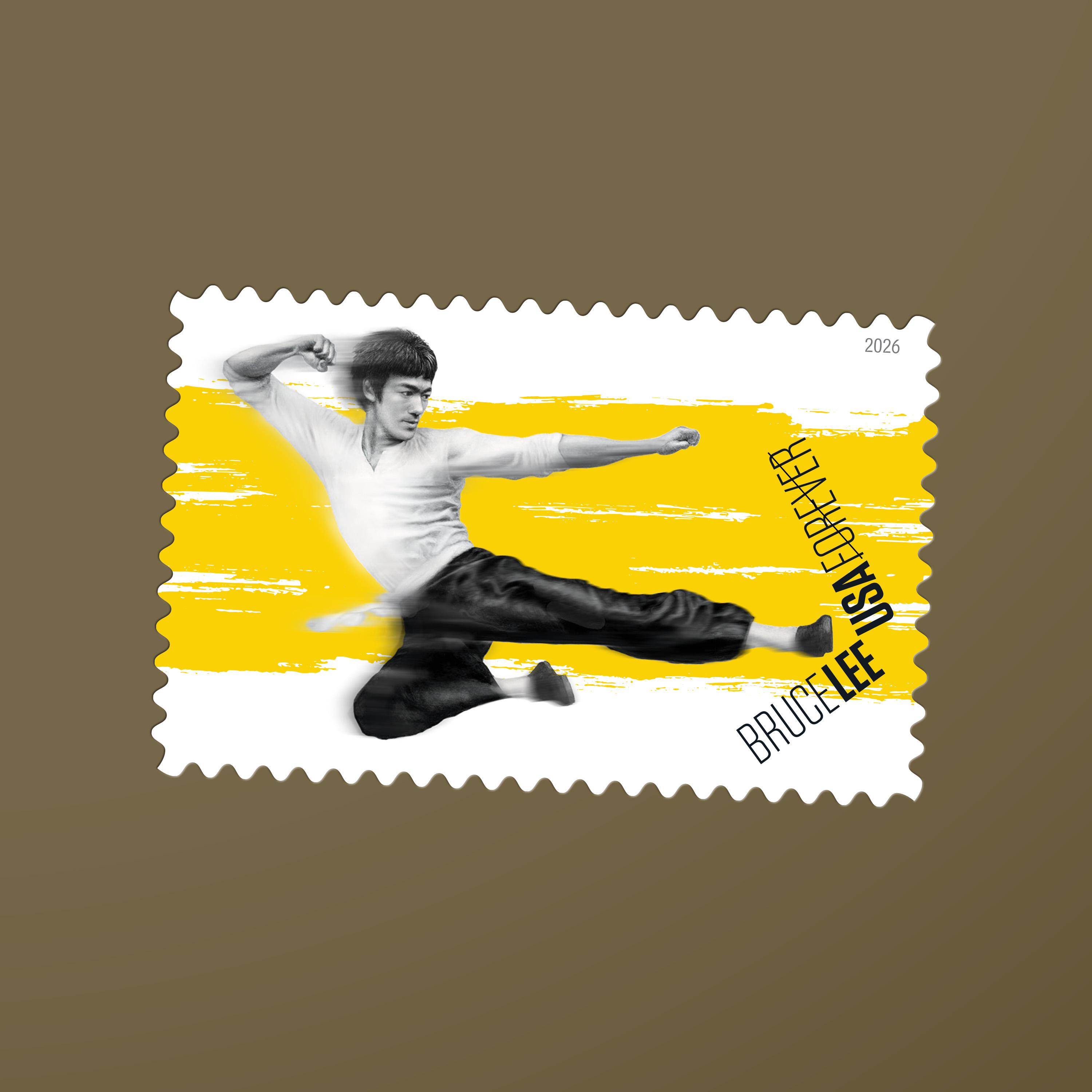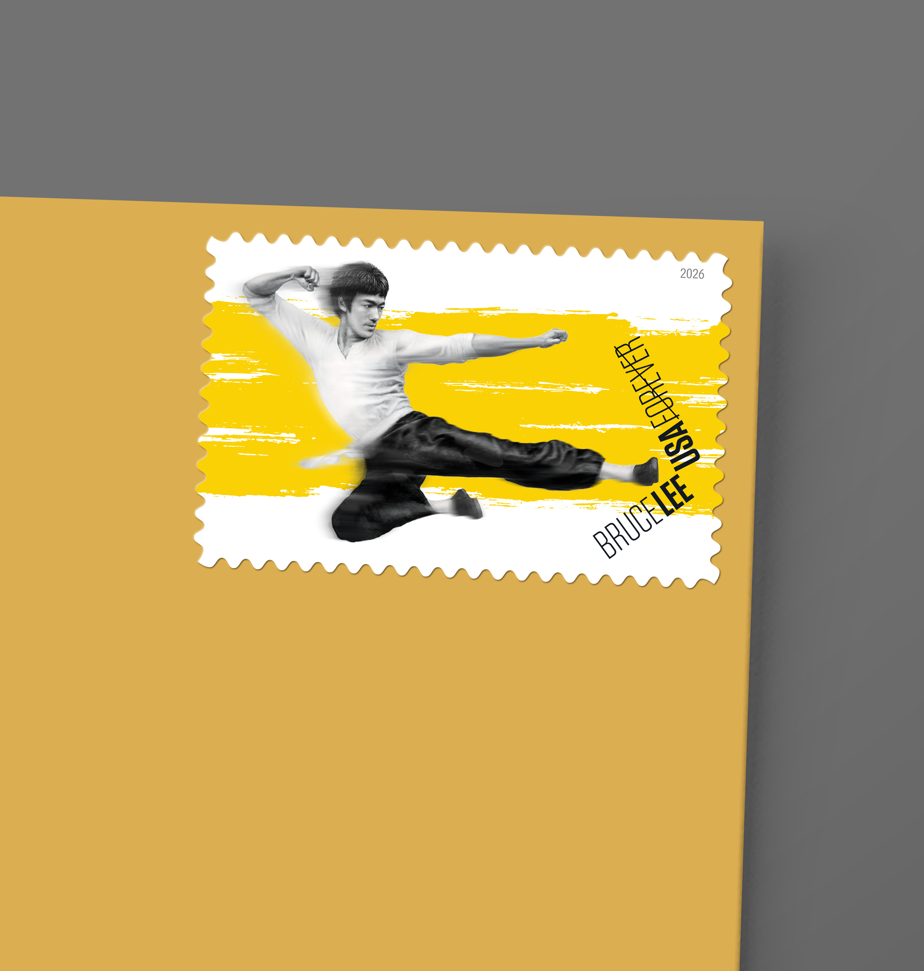 The stamp artwork features Mak’s black-and-white painting of Lee executing his iconic move. Rendered in egg tempera on traditional gesso, the portrait is set against what Alcalá calls “a calligraphic, yellow brush stroke,” a reference to the iconic yellow tracksuit Lee wore in The Game of Death, which was completed and released years after his death. Ingeniously, Alcalá placed the words BRUCE LEE and USA FOREVER vertically and angled, as if Lee’s kick were breaking them in half. This arrangement — with LEE and USA in bold — enhances the action, the art director says. “I think he would have appreciated the design.”