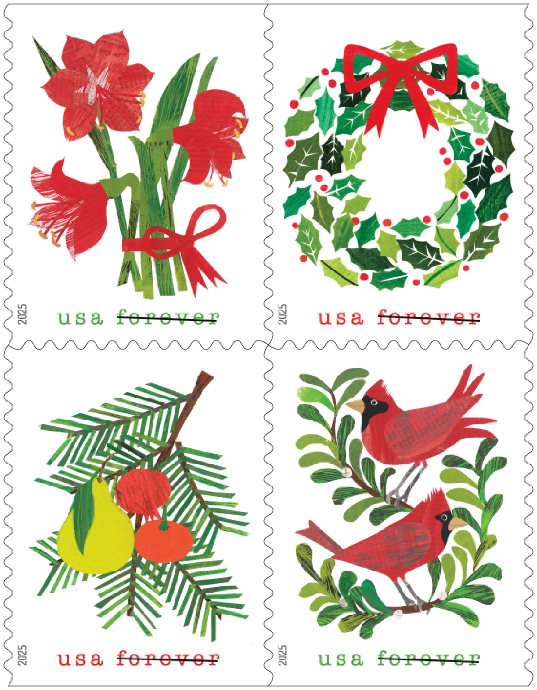 The 2025 USPS holiday stamps were designed by MSU graduate Denise Fiedler.